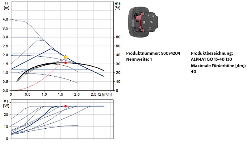 Auf dem Display sieht man, wie gewohnt bei Alpha Pumpen, die Leistungsaufnahme und mögliche Fehlercodes. Oberhalb wird die veränderbare Einstellung der Pumpe übersichtlich angezeigt.Merkmale