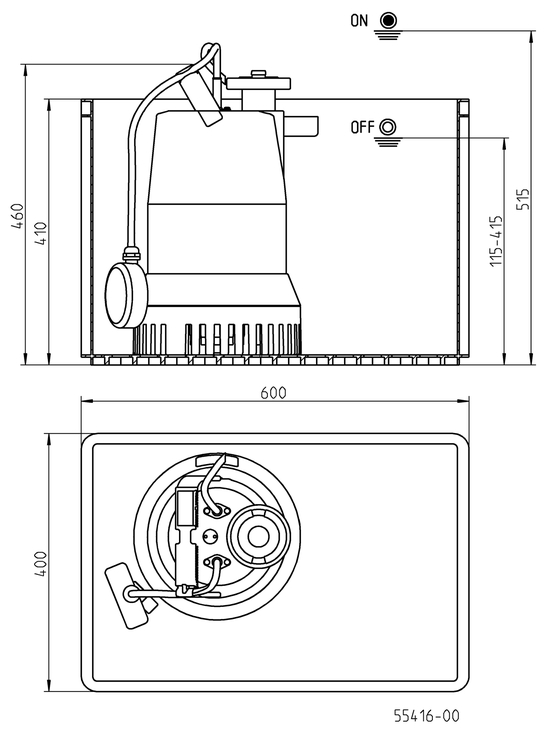 Transportbox eingesetzt werden. Bei fixiertem Kugeltauchschalter und ohne Tragekorb pumpt sie das Wasser bis auf 2 cm Restwasserstand ab.