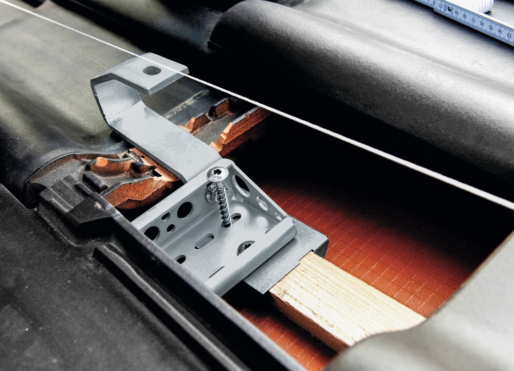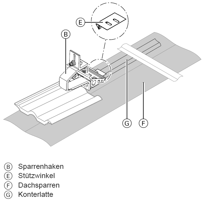 Auf Dächern mit Konterlattung wird der Sparrenhaken mit dem Stützwinkel direkt auf die Konterlatten geschraubt.