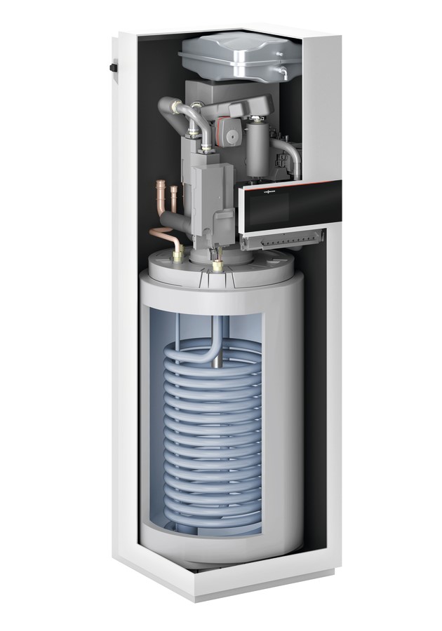 - Integrierter 190 Liter Speicher-Wassererwärmer aus Stahl mit Ceraprotect- Emaillierung, korrosionsgeschützt durch Magnesium-Schutzanode, mit Wärmedämmung