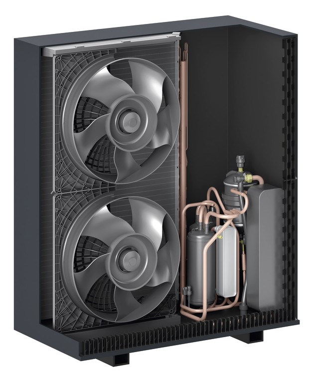 - Invertergesteuerter Verdichter, 4-Wege-Umschaltventil, elektronisches Expansionsventil, Verdampfer, Verflüssiger, EC-Ventilator