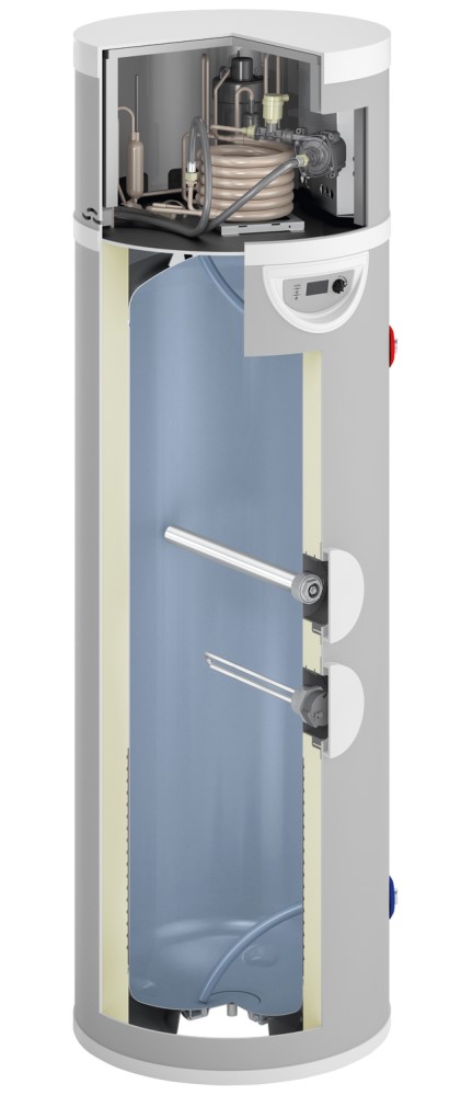 - Speicher-Wassererwärmer mit integrierter Wärmepumpe und trockenem Elektro-Heizeinsatz (Lieferumfang)
