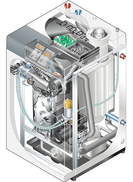 - Mit kesselinternem Ölversorgungssystem zum Anschluss an Einstrangversorgung, bestehend aus flexiblen Ölleitungen und Ölfilterkombination mit gekapseltem Luftabscheidesystem zur Vermeidung von Geruchsbeeinträchtigungen.